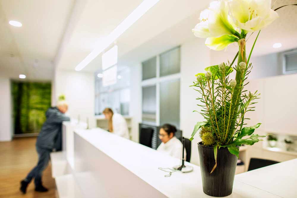 Unsere Praxisräume sind großzügig und mit einem ansprechenden Ambiente ausgestattet. Moderne Anmelde- und Wartebereiche machen den Aufenthalt in unserer Praxis so angenehm wie möglich.